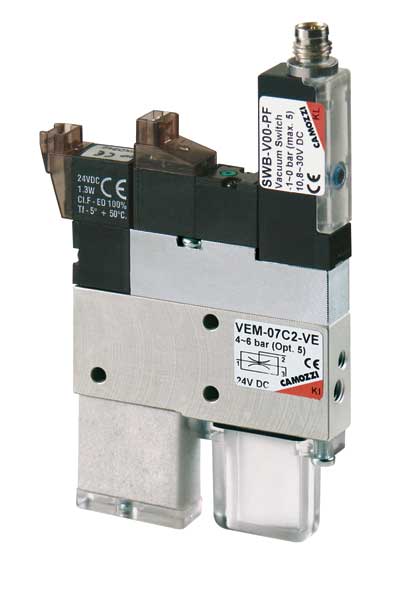 Компактные эжекторы Серии VEM имеют встроенные распределители, разрешающие вакуумирование и сброс, вакуумное реле. Не требуют внешних распределителей.
